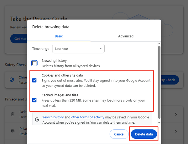 Chrome/Firefox/Edge: Settings → Privacy & Security → Delete/Clear Browsing Data → Select “Cached images and files” and “Cookies and other site data” → Delete/Clear.